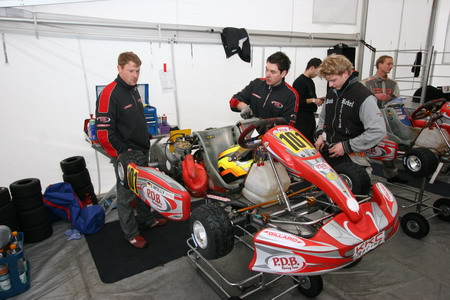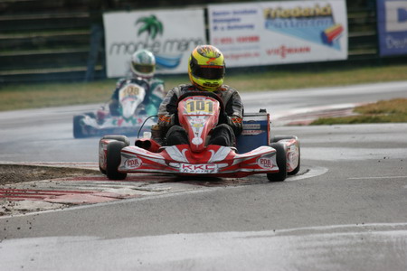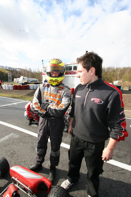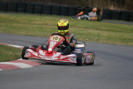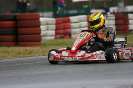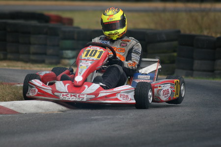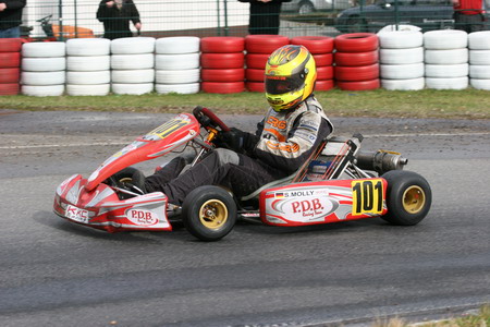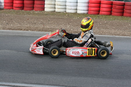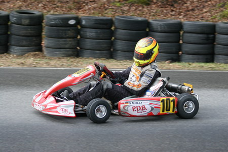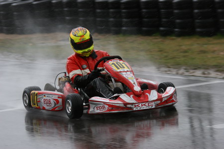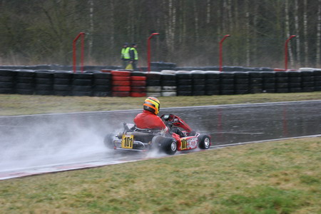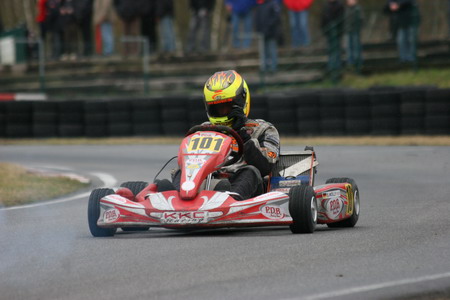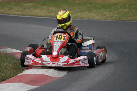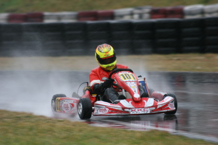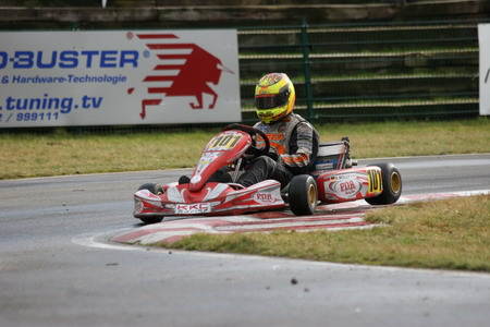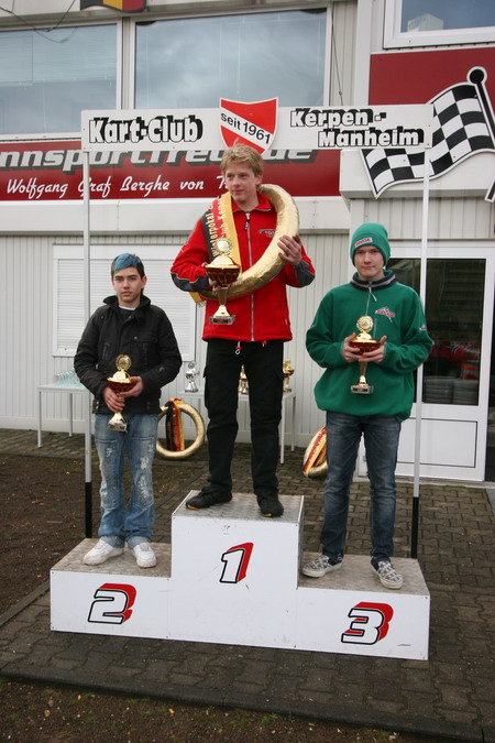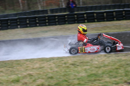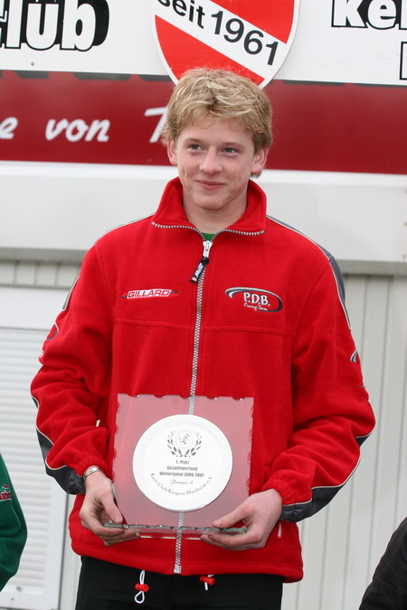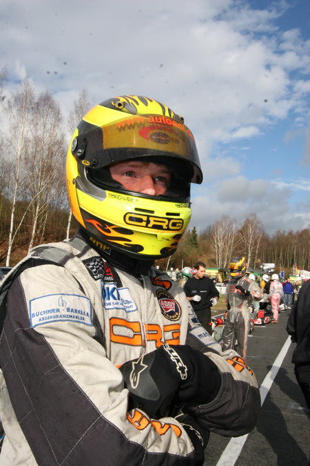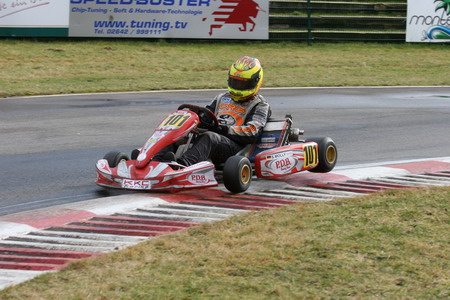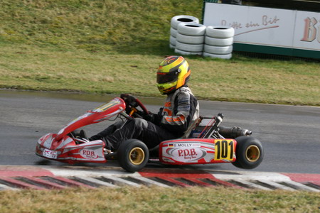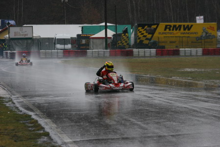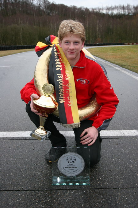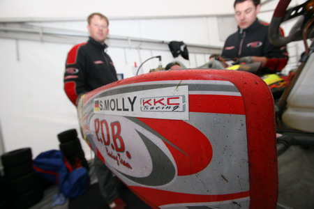 Der amtierende DMV Kartsport Bundesmeister Sascha Molly muss für einen weiteren prestigeträchtigen Pokal in seiner überfüllten Vitrine Platz finden. Ein kurz vorher vereinbarter Gasteinsatz im KKC Racing Team mit neuem Material und bisher unbekannter Technik-Crew erschwerte die Situation für den ambitionierten Nachwuchspiloten zusätzlich. Trotz zweimonatiger Winterpause und den bereits erwähnten Handicaps war Sascha Molly allerdings sofort zu 100% konzentriert und zeigte im Zeittraining eine beeindruckende Performance. „Wow! Das von meinem neuen Teamchef Knut Weinhardt vorbereitete Gillard Material hat zum richtigen Zeitpunkt richtig gut funktioniert. Lediglich ein gebrochenes Achsschenkellager hat mich etwas eingebremst, was allerdings trotzdem für die erste Startreihe gereicht hat.“ freute sich der mehrfache DMV Laufsieger nach dem Qualifying. „Das war zwar aufgrund der wechselhaften Witterungsbedingungen kein einfaches, aber auf alle Fälle sehr erfolgreiches Wochenende für mich. Der Gaststart im KKC Racing Team hat sich rentiert und ich bedanke mich bei meinem Teamchef Knut Weinhardt für die tolle Betreuung, die letztendlich den Gewinn des Winterpokals ermöglichte.“ grinste der frisch gekürte Meister nach der Siegerehrung.